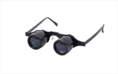 双筒望远镜:是一款看远使用的眼镜式助视器,有2.8倍、3倍、3.5倍等多种倍率,医生根据低视力患者自身的视力情况选择合适的倍率。
